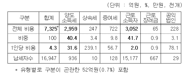 ○ 납세자 유형별로 보면 법인사업자는 5조 416억원(51%), 개인사업자는 4조 1,137억원(41.6%), 비사업자는 7,325억원(7.4%)임
