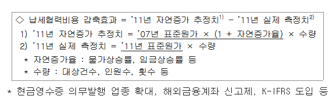 ○ 납세협력비용을 유발하는 새로운 제도*가 도입되었음에도 불구하고 2007년과 비교하면 2011년에는 6,077억원의 감축효과가 있는 것으로 추정되며, 실제로는 더 큰 감축효과가 있는 것으로 판단됨
