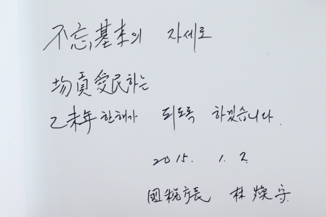 임 청장은 이날 현충원을 참배한 자리에서는 불망기본(不忘其本)의 자세로 균공애민(均貢愛民)하는 을미년 한해가 되도록 하겠다고 방명록에 썼다.