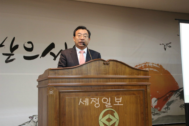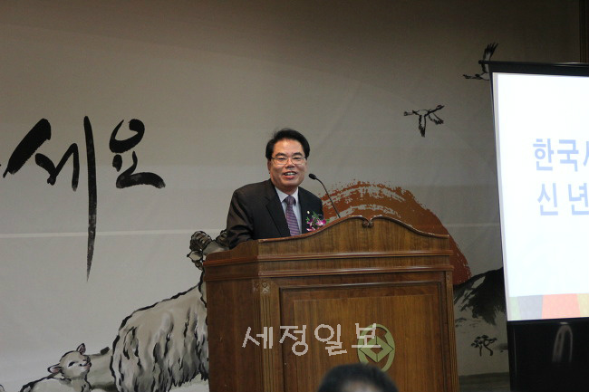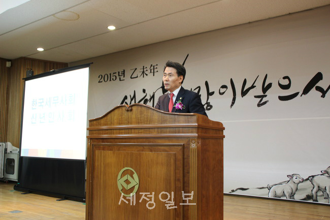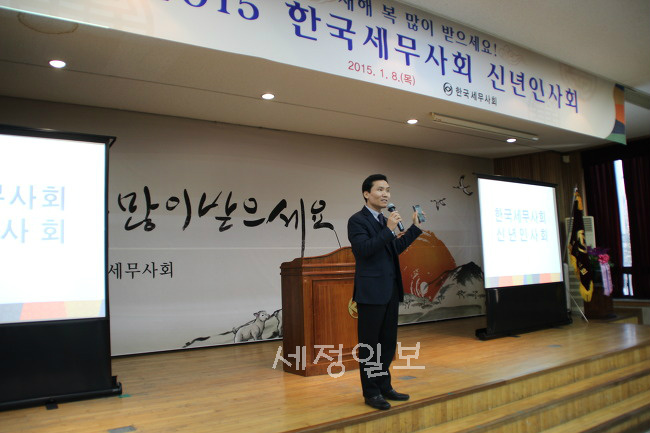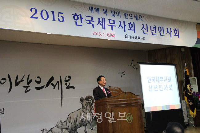 ◆ 8일 2015년 세무사회 신년인사회에서 정구정 회장이 인사말을 하고 있다.