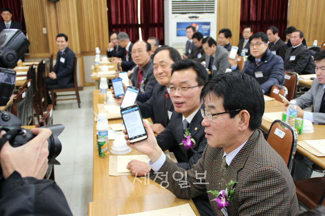 ◆ 임순천 부회장의 설명에 따라 다큐토리를 시험해보던 회원들이 포즈를 취했다. 사진 오른쪽부터 백정현 감사, 이동일 감사, 임정완 윤리위원장이 스마트폰을 들어보이고 있다.