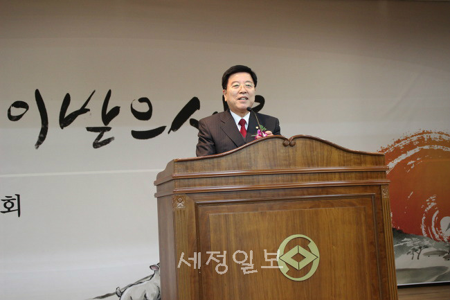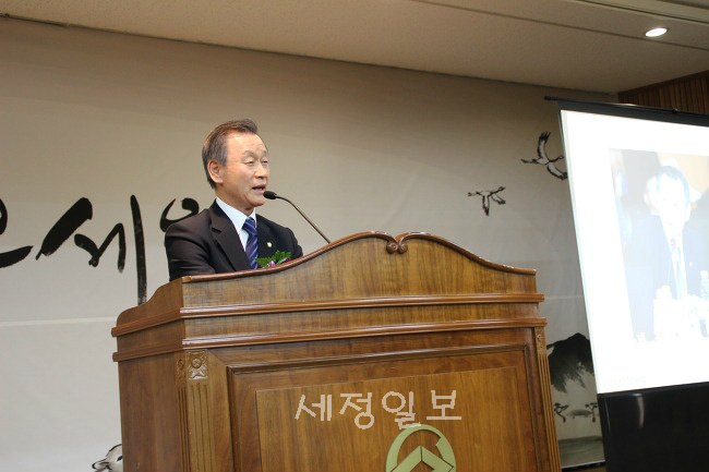 ◆ 정구정 회장 칭찬에 시간을 많이 할애한 김광림 의원이 축사를 하고 있다.