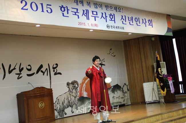 ◆ 전문소리꾼 이효녕씨가 세무사들의 새해 축복을 기원하는 판소리를 하고 있다.