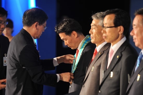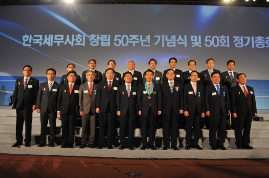 ◆…한국세무사회 50주년 기념식에서 김황식 국무총리가 정구정회장에게 은탑산업훈장을 수여하고 있다.오른쪽으로 김종화 부회장, 한헌춘 중부세무사회장, 임채룡 자문위원.[사진: 세무사회 제공]