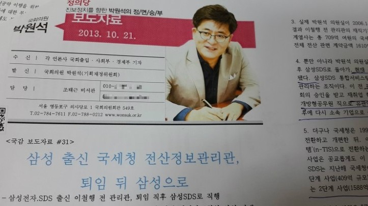 박 의원은 “'국세청 전산계약 대장'을 분석한 결과 이 인물의 국세청 재직 시기 동안 삼성SDS, 삼성전자 등 삼성의 국세청 전산 관련 계약 비중이 44%에 달하는 것으로 나타났다”고 밝혔다.