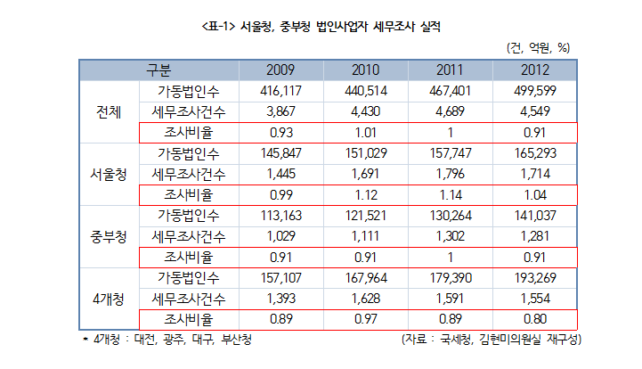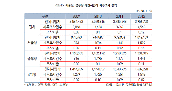 22일 민주당 김현미 의원은 지난 2009년부터 2012년까지 서울국세청과 중부국세청의 법인사업자에 대한 세무조사 비율은 0.9~1.0% 범위 내에서 거의 변화가 없거나 2010년 이후 오히려 미세하게 감소하는 추세를 보였지만, 개인사업자에 대한 세무조사 비율은 2009년 0.09%에서 매년 증가추이를 보이고 있다고 밝혔다. 특히 2012년에는 0.12%까지 치솟았다고 덧붙였다.