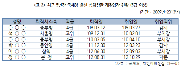 민주당 김현미 의원(일산 서구)은 “최근 5년간 국세청 취업제한대상자중 사기업체에 재취업한 5급 이상 공직자는 건설, 금융, IT 등 모두 26명으로, 이 중 2009년부터 2013년 사이 총 6명이 ‘삼화왕관(주)’에 재취업했다”고 밝혔다. 그러면서 “이들 중 6명(23%)이 1개 업체로 이동한 것에는 특별한 이유가 있는 것 같다”고 의혹을 제기했다.