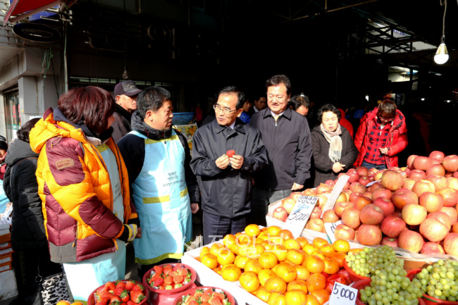 김 청장은 수입물품의 거래동향과 원산지 표시 적정 여부 등을 점검하고, 상인대표들로부터 전통시장의 애로사항을 청취하는 한편 온누리상품권으로 과일, 채소 등 설 성수품을 구매했다.