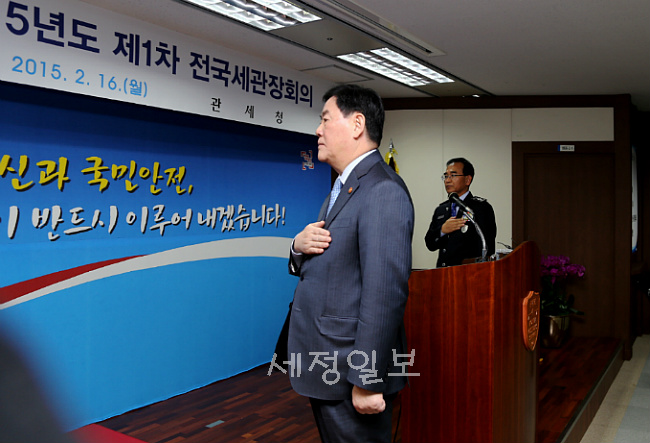 ◆ 국민의례를 하고있는 최경환 경제부총리(왼쪽)와 김낙회 관세청장.