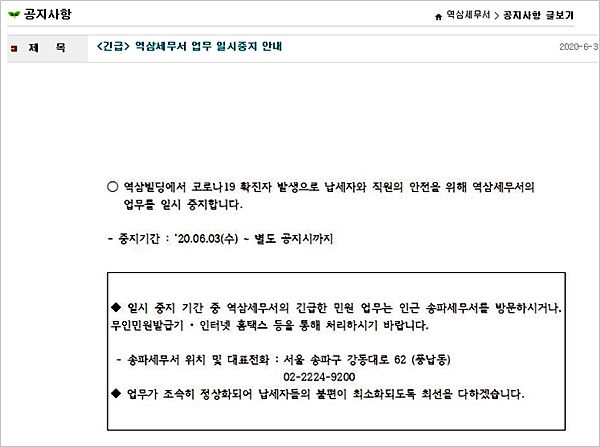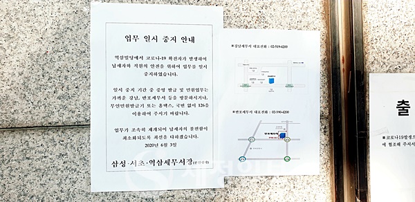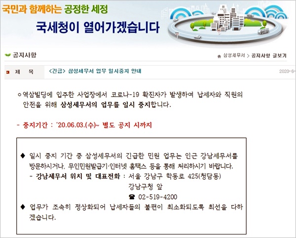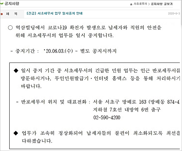 역삼·서초·삼성세무서가 입주해있는 역삼빌딩에서 코로나19 확진자가 발생해 세무서가 업무를 일시 중단하고 내일(4일)부터 업무를 재개한다.