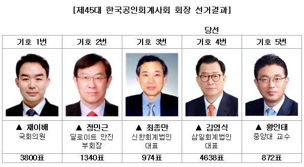 이날 선거에서 채이배 전 국회의원(3800표), 정민근 딜로이트 안진 부회장(1340표), 최종만 신한회계법인 대표(974표), 황인태 중앙대 교수(872표) 등 4명의 후보를 제치고 당선된 김영식 회장은 “과거는 잊고 오로지 새로운 미래를 위해 뛰어나가겠다”고 밝혔다.