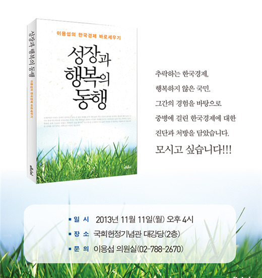 이 의원은 “책 속의 주장들을 이끄는 나침반은,‘지속가능한 성장’도 함께 고려했지만 결국은 ‘국민행복’”이라면서, ‘국민행복과 경제성장의 아름다운 동행’이 우리 경제가 나아가야 할 궁극의 방향이자 정치인 이용섭의 최종 목표임을 강조했다.