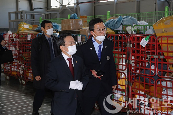 노석환 관세청장이 가파르게 증가하는 해외직구물품 등 특송화물에 대한 효율적 위험관리와 신속한 통관지원 상황을 직접 살피고자 11일 평택직할세관의 해상특송장을 직접 점검했다.