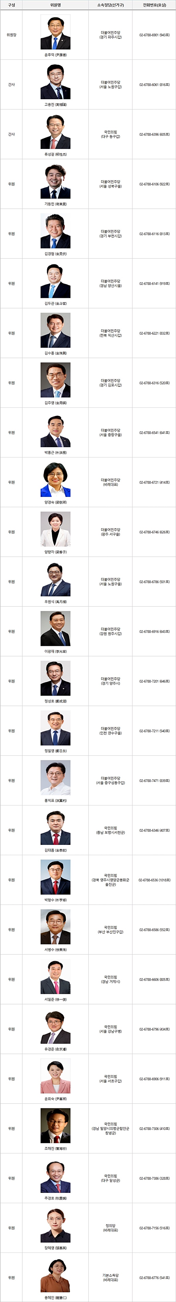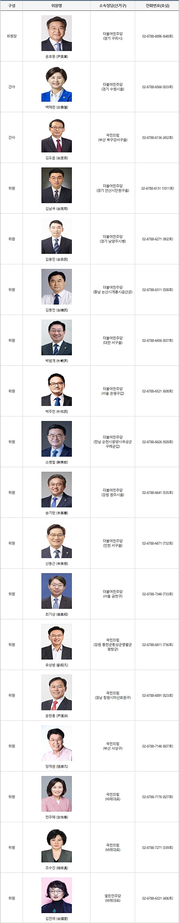 현재 법사위에는 18명 중 11명(61%)이 법조인 출신이다. 민주당에서는 백혜련 간사(사시39)를 비롯해 김남국(변호사시험1회), 김용민(사시45), 박범계(사시33회), 박주민(사시45회), 소병철(사시25회), 송기헌(사시28회), 최기상(사시35회) 의원이, 국민의힘에서는 김도읍 간사(사시35)와 유상범(사시31), 전주혜(사시31) 의원이 법조인 출신이다.