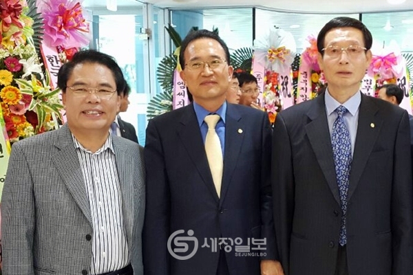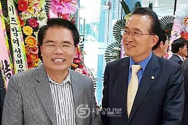 ▶ 차기 한국세무사회장 선거에 출마가 예상되는 백운찬 전 관세청장이 10일 서울지방법원 예식장에서 열린 곽수만 한국세무사회 부회장의 장남 결혼식장에서 하객으로 참석한 백재현 의원과 포즈를 취했다.