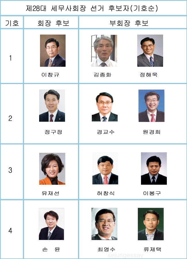 이로써 차기 세무사회장 선거전은 ‘4파전’의 투어(18일 서울, 19일 부산, 20일 대구, 21일 대전, 24일 광주, 25일 중부)로 열전의 막이 올랐다.