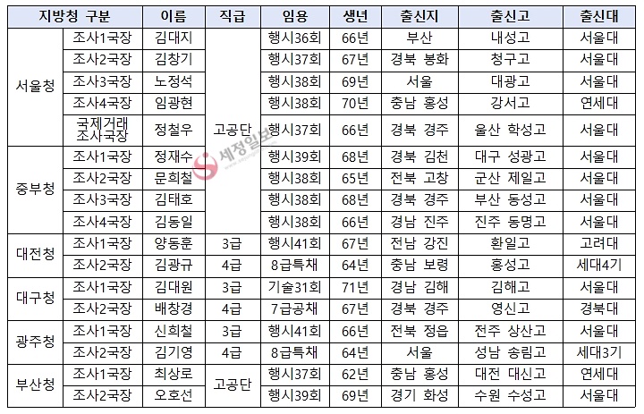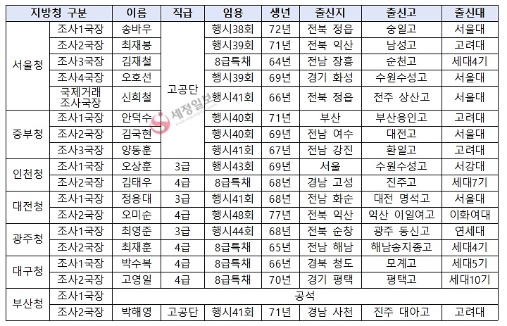 호남 출신 조사국장은 문희철 중부청 조사2국장(65년, 전북 고창, 서울대, 행시38), 양동훈 대전청 조사1국장(67년, 전남 강진, 고려대, 행시41), 신희철 광주청 조사1국장(66년, 전북 정읍, 서울대, 행시41)이었다.