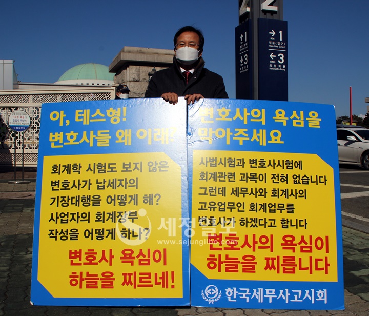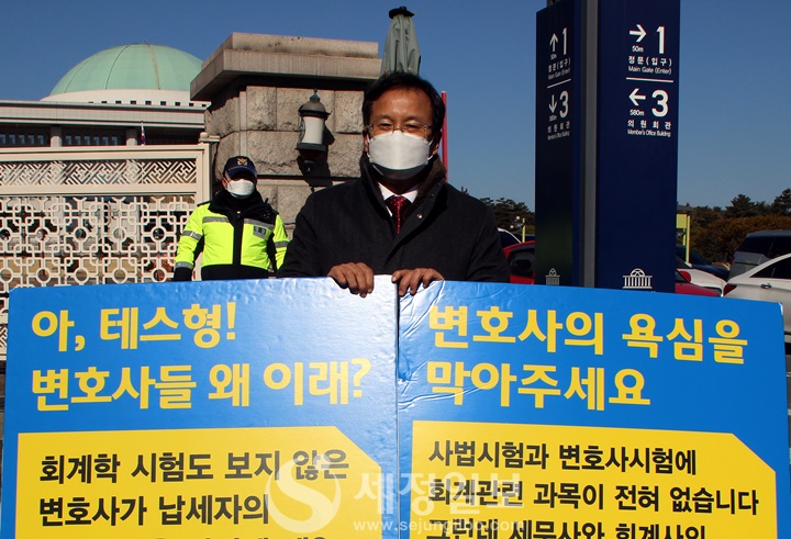 국회 앞 1인 시위에 나선 이금주 인천지방세무사회 회장이 ‘수적천석’의 각오로 2월 임시국회에서의 세무사법 개정안 통과를 기원했다.