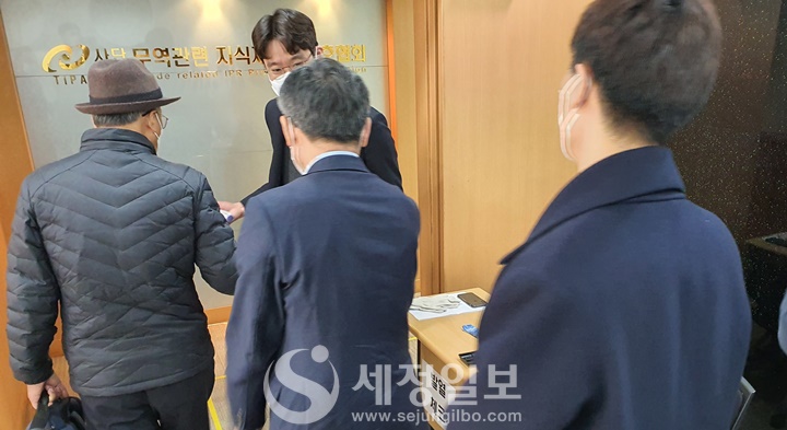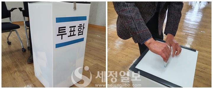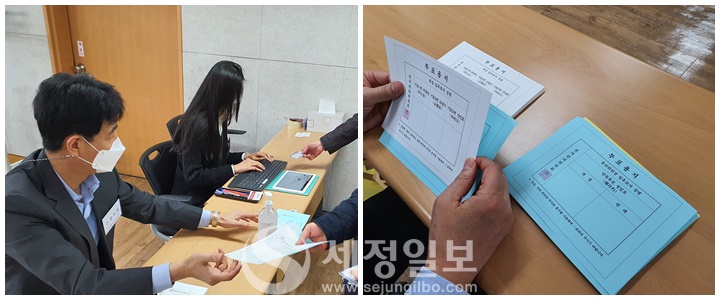 이어 선거관리위원회 측으로부터 관세사 회원증 혹은 신분증을 확인받은 뒤 회장과 윤리위원장 입후보자(단독후보 정임표)가 적힌 투표용지를 받아들고, 기표소에서 투표를 마치는 모습이었다.