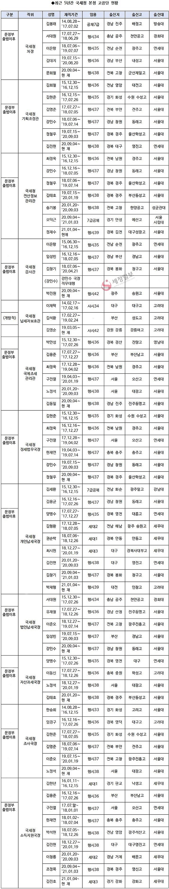 특히 개인납세국장은 2018~2019년 연달아 8급 특채인 세무대학 출신의 국장들이 임명됐는데, 김형환 국장(세대2기), 권순박 국장(세대1기), 최시헌 국장(세대3기)이 개인납세국장을 지냈으며, 소득지원국장에는 2016년 김한년 국장(세대1기), 2020년 이청룡 국장(세대2기), 2021년 현재 김진호 국장(세대3기)이 비고시 출신이었다.
