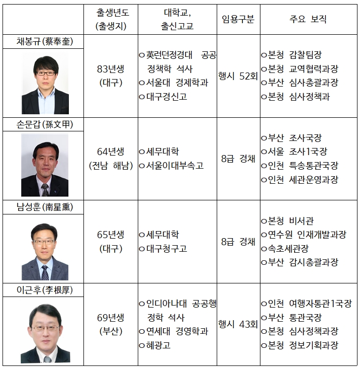 ■ 과장급 전보 (2021년 4월 14일자) △본청 비서관 채봉규 (蔡奉奎) △인천세관 여행자통관1국장 손문갑 (孫文甲) △부산세관 조사국장 남성훈 (南星熏) △관세청 이근후 (李根厚) ■ 과장급 전보자 프로필