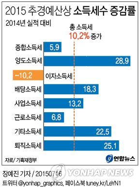 정부 추계대로라면 소득세와 법인세 수입 격차가 올해 14조7천679억원으로 더 커지게 된다.