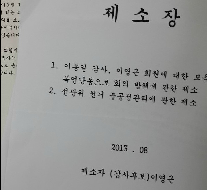 제소 이유는 지난 7월 31일 본회에서 개최된 ‘임원선거와 관련한 선관위의 투·개표 업무진행 사항 등 관련자료 공개’ 등을 논의하기 위한 회의에서 자신(이영근 회원)에 대한 모욕과 함께 폭언, 난동으로 회의를 방해 했다는 것.