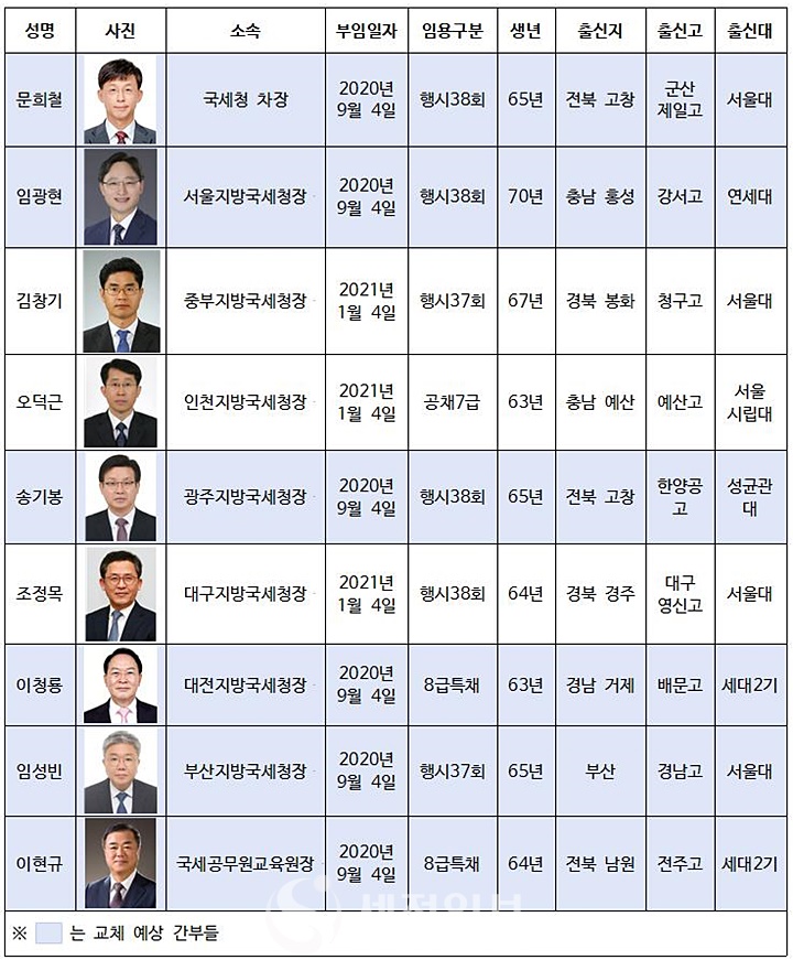이들 외에도 6월말 기준 교체대상에 임성빈 부산지방국세청장(1급), 이청룡 대전지방국세청장(2급), 송기봉 광주지방국세청장(2급) 등이다. 국세공무원교육원장도 실질적으로 지방국세청장급으로 대우한다는 측면에서 이현규 국세공무원교육원장(2급)도 교체 대상에 포함된다.