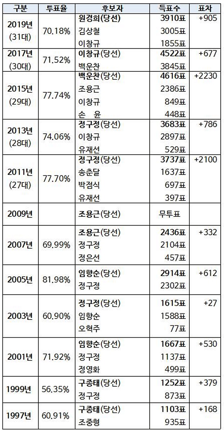 이어 정구정 전 회장이 3선의 논란을 불러일으키는 등 풍파를 딛고 내리 4년간 회장직을 맡았다.