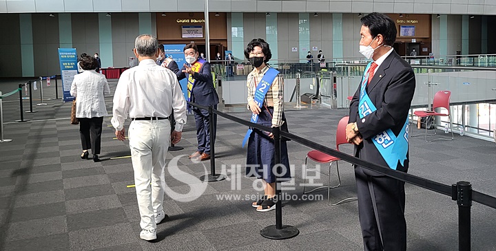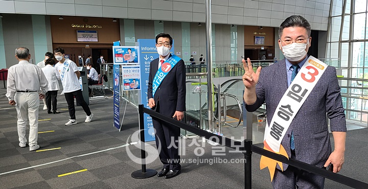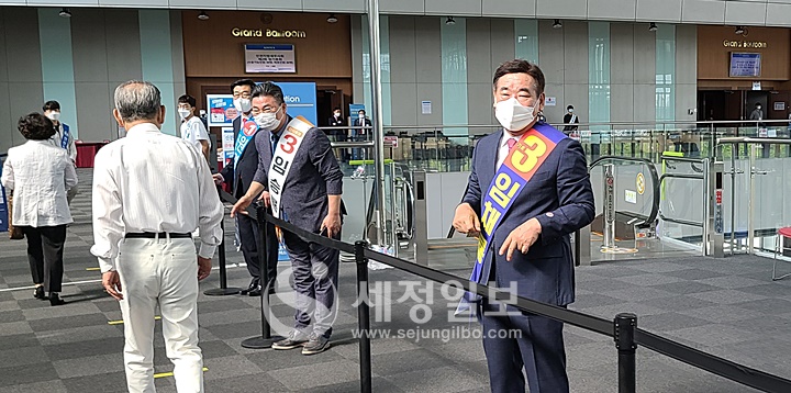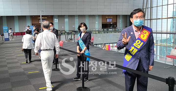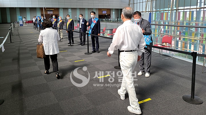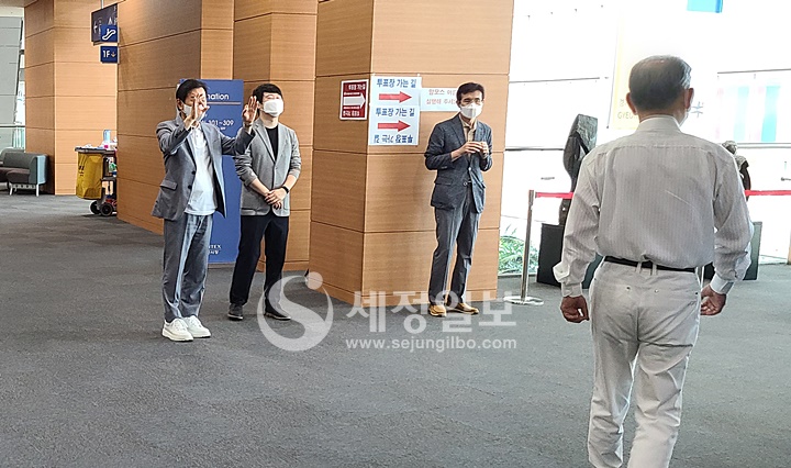 그리고 또다시 발열체크, 손소독제 사용을 마쳐야 투표장에 입장할 수 있었고, 투표를 마치고 나오면 돌아가는 길목에 이금주 인천회장과 단독 후보로 출마한 김명진 인천회장 후보 등이 회원들에게 인사를 건네고 있었다.
