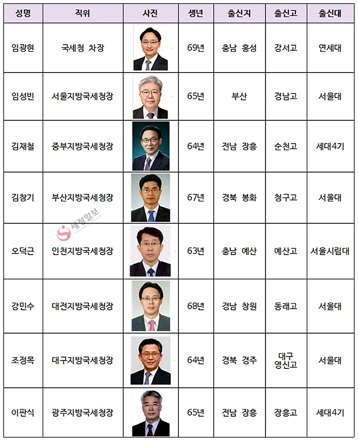 서울청장에 임성빈 부산청장을 전보 발령했고, 중부국세청장에는 김재철 서울국세청 조사3국장을 임명했다. 이어 부산국세청장에는 김창기 중부국세청장을, 대전청장에는 강민수 국세청 법인납세국장을, 광주청장에는 이판식 부산청 징세송무국장을 각각 임명했다.