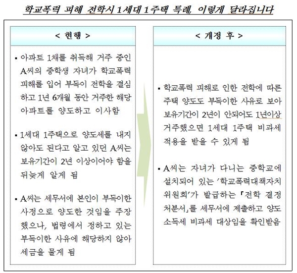 ㅇ 학교폭력 피해로 인한 전학으로 주택 양도시 보유기간 요건에 상관없이* 1세대 1주택 양도세 비과세 적용