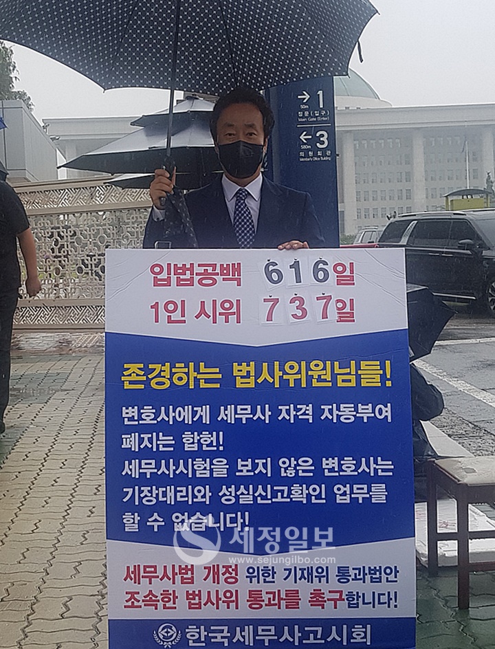 가을비가 짓궂게 내리는 가운데 황성훈 ‘세무대학 세무사회’ 회장(세무법인 한맥 대표)이 세무사법 개정을 촉구하는 1인 릴레이 시위에 나섰다.