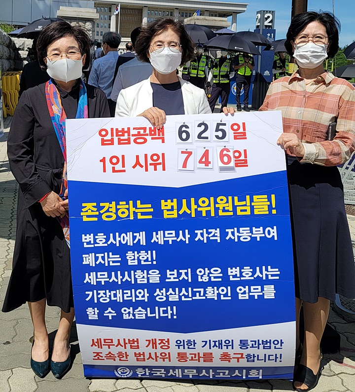 한국세무사고시회(회장 이창식)가 주관하는 ‘국회 세무사법 개정 촉구 1인 릴레이 시위’가 갈수록 뜨겁다. 매일 1인시위로 이어가던 세무사들의 국회 앞 농성은 추석 연휴가 끼이자 지난 13일~16일까지 4일간의 시위 중 여성세무사회 전 현직 회장 3명이 동참해 유보 중인 세무사법 개정을 통과시켜달라고 목청을 높였다.