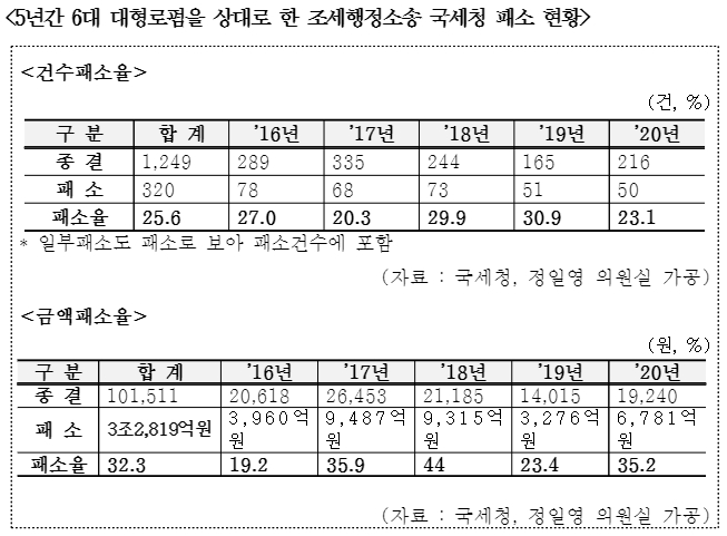 28일 더불어민주당 정일영 의원(인천 연수을, 기획재정위원회)이 국세청으로 받아 분석한 자료에 따르면 지난 5년간 국세청이 6대 대형로펌을 상대로 한 조세행정소송에서 패소한 금액은 2016년 3960억원, 2017년 9487억원, 2018년 9315억원, 2019년 3276억원, 2020년 6781억원으로 집계됐다.