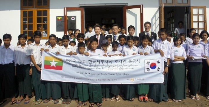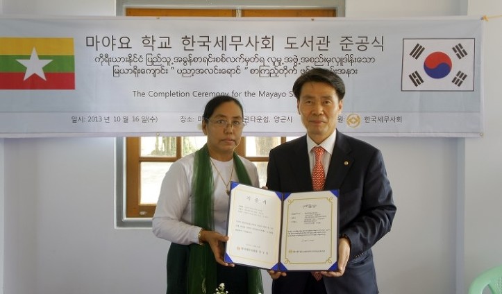 18일 세무사회에 따르면 정구정 한국세무사회장 일행은 지난 16일 미얀마 양곤주 딴린시 마야요 학교(학교장 토 테이 : Daw Htay Yi)를 방문, 우쩌민(U Kyaw Min) 딴린시 국회의원, 우킨아웅민(U Khin Aung Myint) 딴린시 교육감 등 미얀마 정부관계자와 마야요 학교장을 비롯한 교사 및 1000여명의 학생과 주민들이 참석한 가운데 한국세무사회 도서관 준공식 겸 기증식을 가졌다.