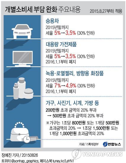 정부는 26일 경제관계장관회의를 열어 자동차와 대형 가전제품에 붙는 개별소비세율을 5%에서 3.5%로 인하하는 내용 등을 담은 소비 활성화 대책을 확정해 발표했다.