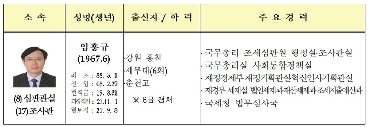 8급 경채로 공직에 임용된 임홍규 과장은 국세청 법무심사국, 재경부 세제실 및 재정기획관실과 국무총리실 사회통합정책실 등을 거쳐 조세심판원에서는 행정실에서 업무경력을 쌓았고, 지난 9월부터 8심판부(17)에서 일하고 있다.