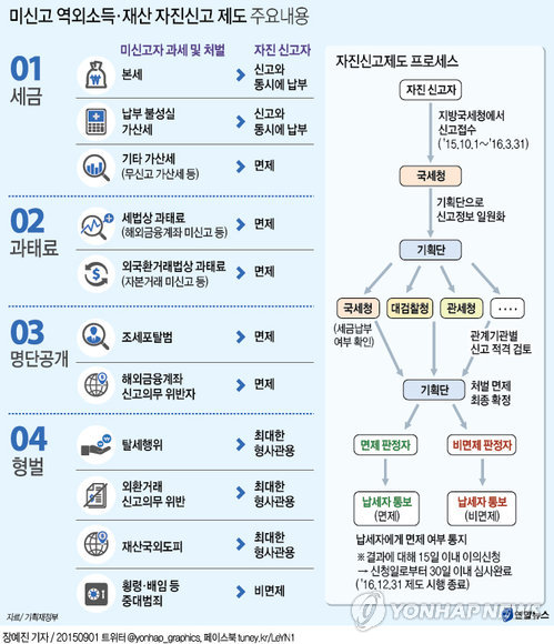 정부는 자진신고기간이 끝나면 해외 은닉 소득과 재산에 대한 세무조사와 검찰수사를 벌여 엄중하게 과세하고 처벌할 방침이다.