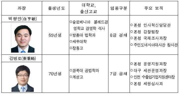 ■ 과장급 전보 (2021년 12월 28일자) △관세청 운영지원과장 백형민 (白亨敏) △관세청 행정관리담당관 강병로 (姜秉輅) ■ 과장급 전보자 프로필 김승현 기자 shppy069@naver.com 기자의 다른기사 저작권자 © 세정일보 무단전재 및 재배포 금지 관련기사 관세청, 인사업무 운영지원과로 이관 운영지원과장도 교체 최신 기사 차규근 “배당소득 분리과세율 인하 수용못한다…초부자 감세, 불평등만 심화” 관세사회, 우원식 국회의장 면담…성실신고확인제 필요성 설명 [현장] ‘국세공무원의 꽃’ `25년 하반기 서기관 승진자 30명에 임명장 수여식 국세청, ‘기획·정보·대변인실’ 사무관 자리 하나씩 늘린다 동아쏘시오그룹, 중대재해 대응 모의훈련 실시···심폐소생술·자동심장충격기 실습 NH농협은행, 2025년 ‘디지털금융 혁신대상‘ 최종 우수사례 선정 韓 3분기 경제성장률 26개국 중 3위…내년 2.3% 전망도 등장 차규근 “배당소득 분리과세율 인하 수용못한다…초부자 감세, 불평등만 심화” 추천기사 국세청, 태광산업 세무조사 ‘인프라·레저 계열사’까지…‘5년 치 장부’ 뒤진다 론스타와 13년 분쟁, 국제투자분쟁에서 최초 ‘대한민국 승’…조세주권 지켰다 국세청, 세무공무원 출신 세무사 등 ‘세금 유튜버’ 전수 확인했다 상속세 과세, 유산취득세로 변경 시 ‘국세청 세무조사 조항’도 바뀐다 '마약의 나라' 되나?…청년층 타깃 클럽마약 '케타민의 급습' 5년간 7.3배 급증 [세미콜론] 아직도 이런 폐습이~…국세청 ‘간부 모시는 날’ 고강도 감찰