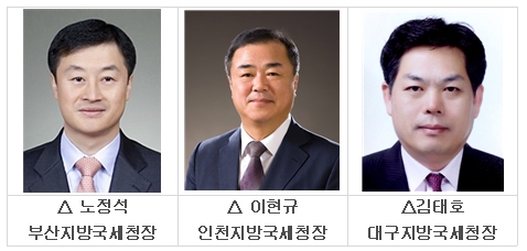 김대지 국세청장은 30일 부산지방국세청장에 노정석 국세청 법인납세국장을, 인천지방국세청장에 이현규 서울청 조사3국장을, 대구지방국세청장에 김태호 국세청 개인납세국장을 각각 임명했다.