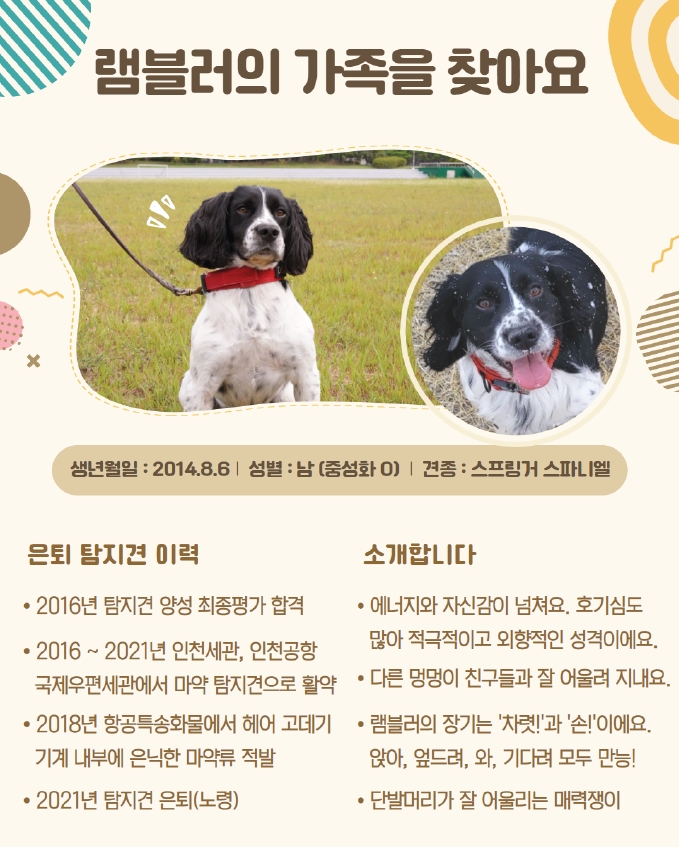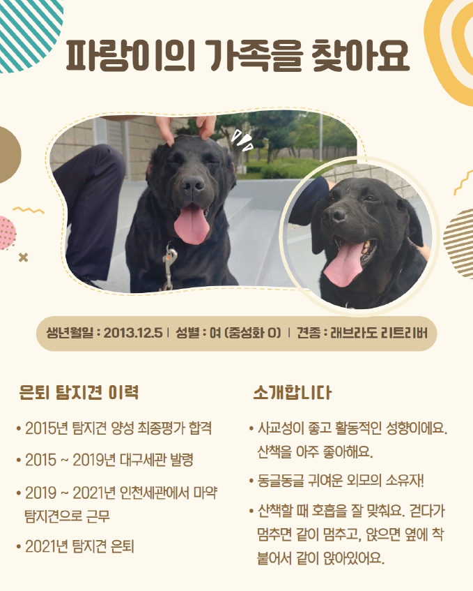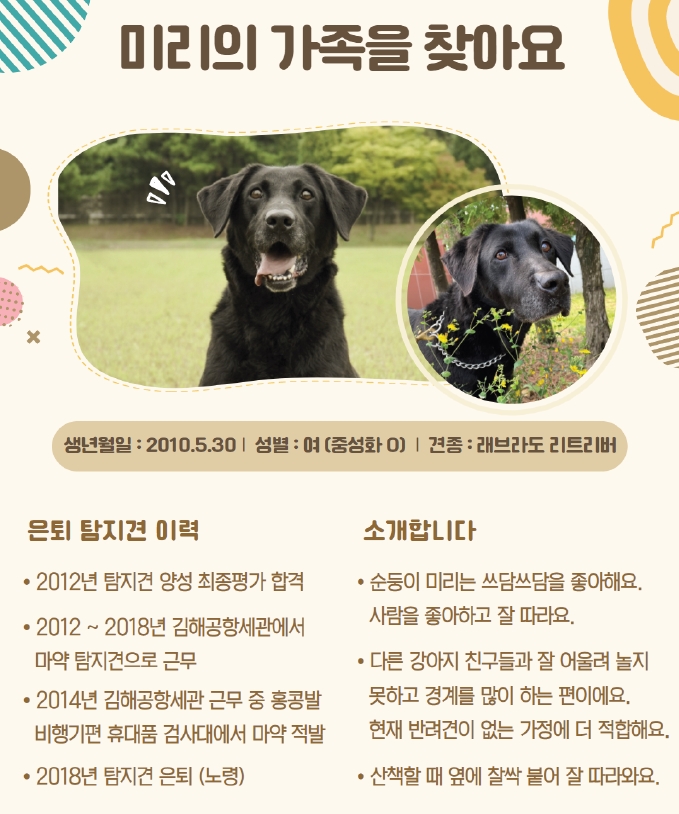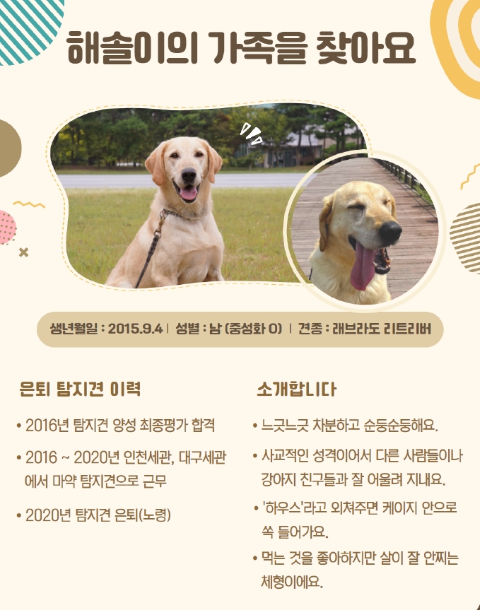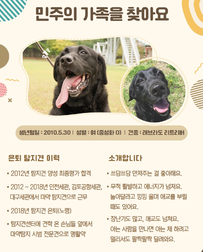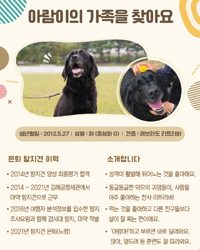 관세청 마약탐지 은퇴견은 나이가 다소 많지만, 친화력이 뛰어나고 영리해 현역시절 많은 활약을 보여줬고, 훈련 교관과 탐지조사요원 뿐만 아니라 현장에서 일하는 세관 직원의 사랑을 듬뿍 받아왔다.