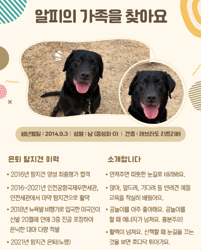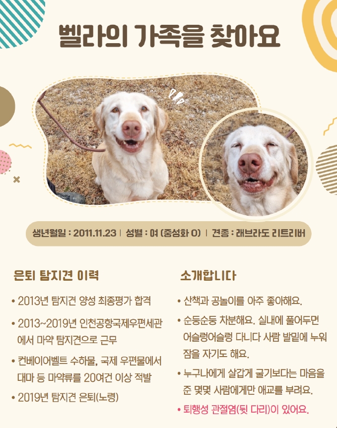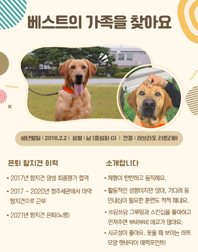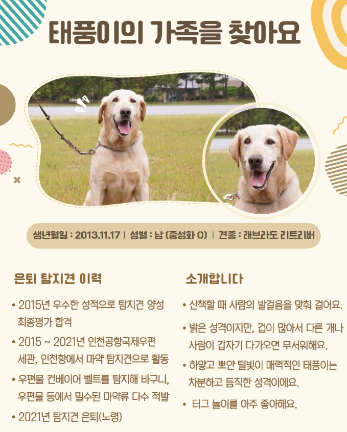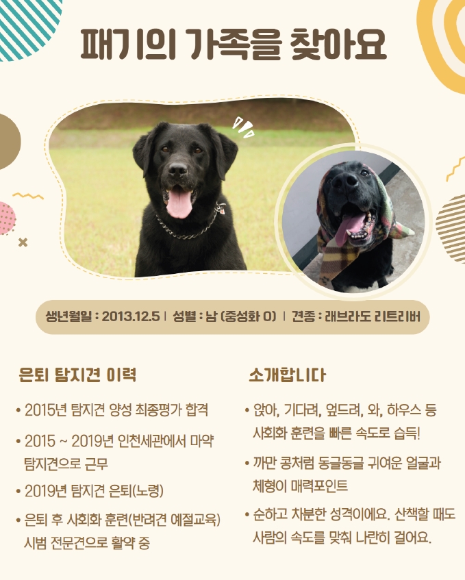 관세청 마약탐지 은퇴견은 나이가 다소 많지만, 친화력이 뛰어나고 영리해 현역시절 많은 활약을 보여줬고, 훈련 교관과 탐지조사요원 뿐만 아니라 현장에서 일하는 세관 직원의 사랑을 듬뿍 받아왔다.