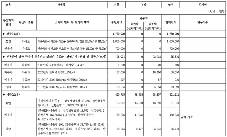 전년대비 7200만원 늘어, 배우자 차량 3개 소유