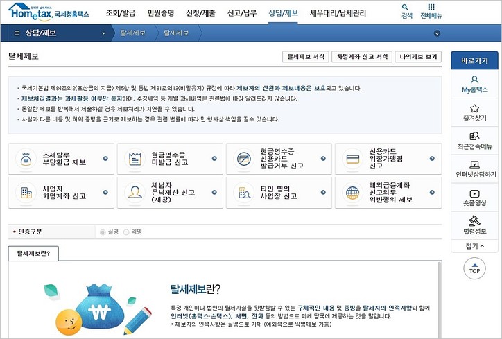이에 국세청은 홈택스 상에서 각각의 유형을 설명하고 있는데, 탈세제보가 가능한 대상은 무려 8개였다.