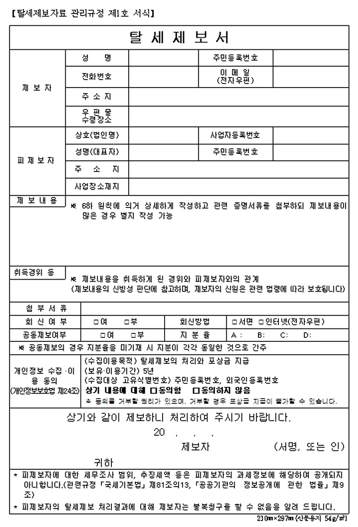 이외에도 개인 또는 법인사업자가 다양한 방법으로 조세를 탈루하거나 부당하게 환급·공제받는 모든 행위도 제보가 가능하며 부동산 매매 거짓계약서 작성 및 미등기 양도 행위와 상속세 및 증여세 신고 누락 행위도 신고할수 있다.