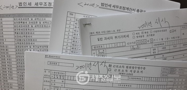 ▶황선의 세무사가 자신의 사무실 창고에서 찾아 낸 '2001년도 법인세 세무조정계산서 총괄표' 등.