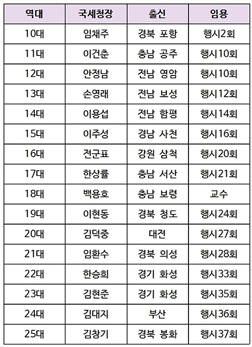 문민정부 이후로 역대 네 번째 TK(대구‧경북) 출신 국세청장이 탄생했다. 그리고 김태호 국세청 차장이 임명되면서 26년 만에 청장과 차장이 모두 TK출신으로 채워지는 역사가 기록됐다.