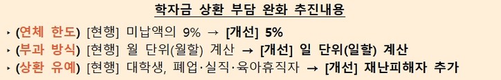 아울러 고용악화 등으로 학자금 상환에 곤란을 겪고 있는 청년 채무자의 경제적 재기 지원을 위해 상환 부담 완화를 추진한다. 학자금 체납 연체금 한도 인하, 계산 방식 변경과 함께 재난 피해자 등에 상환 유예(2년)를 지원할 수 있도록 제도개선을 추진한다.
