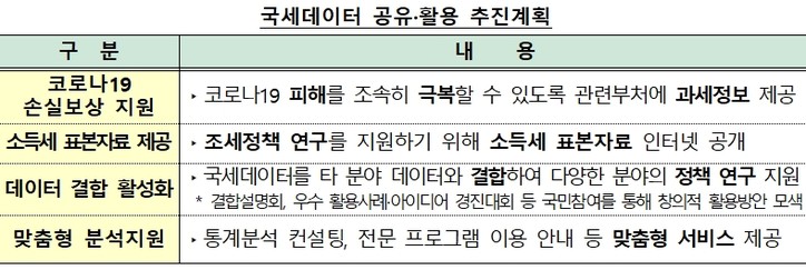 국세데이터를 쉽게 활용할 수 있도록 이용자별 맞춤형 분석 서비스 제공하고, 디지털플랫폼정부 구축, 코로나19 손실보상, 지역상권 활성화 등 공익목적 과세정보 요구에 대해 법 규정 내 신속하게 제공한다.
